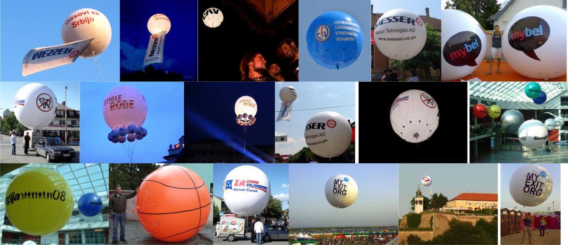 Cepelini i lopte, reklama sa svetlom iznad gradaNovi Sad Prodajemo cepeline i lopte prečnika do 4m i dužine do 8m. Ugrađujemo i osvetljenje u iste. Ako želite da za vašu reklamu sazna ceo grad za tri dana, ovi objekti napunjeni helijumom su rešenje. Sve je na lageru u Novom Sadu.