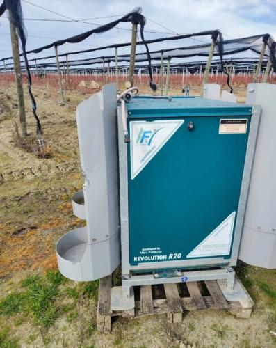 Zastita od mraza Agrofrost R20Novi Sad Masine za zastitu od mraza. Masina ṣ̌titi 1ha. Troṣ̌i 10 kg gasa na sat rada. Ukupno moze da radi oko 12 sati sa jednim setom boca. Uz masinu se prodaju i boce za plin. Masina se koristi u zasadima jabuke, kruske, tresnje, kajsije, odnosno stubastog voca.